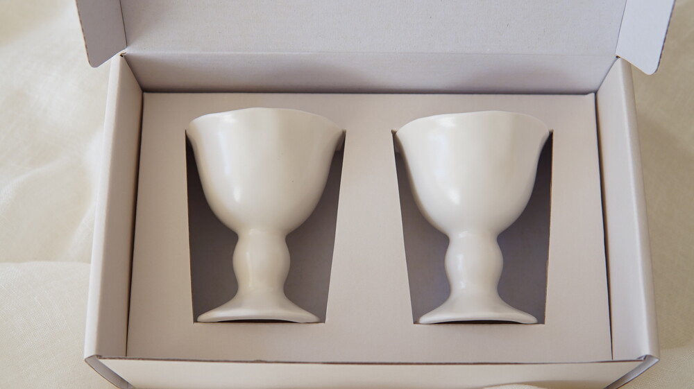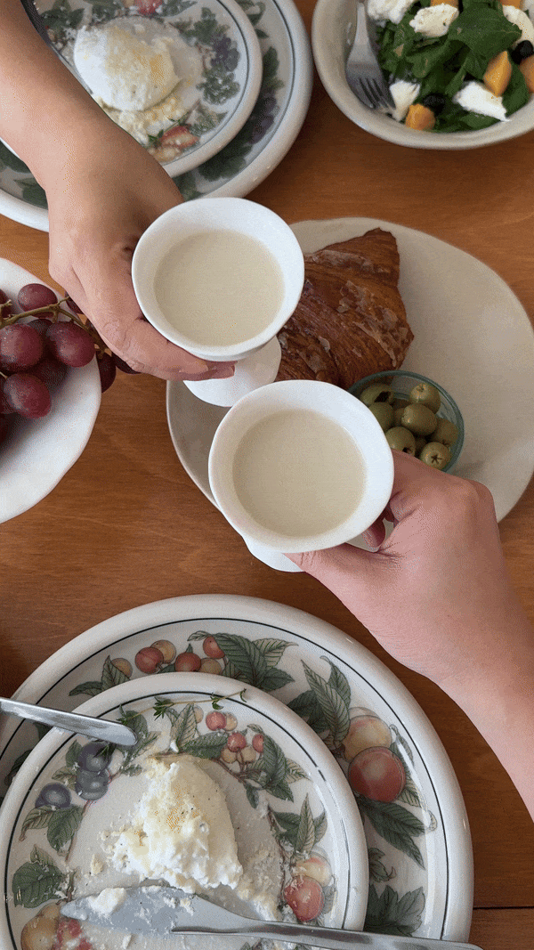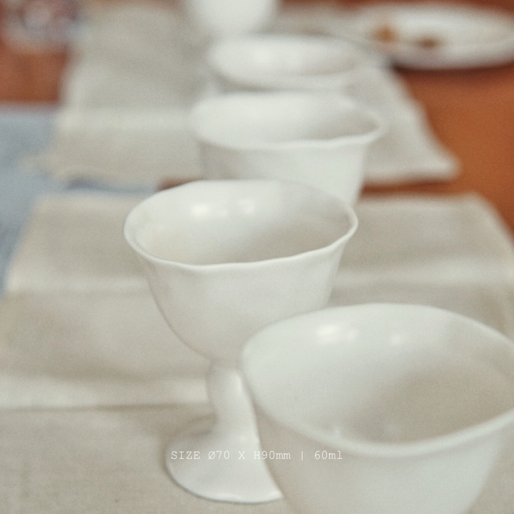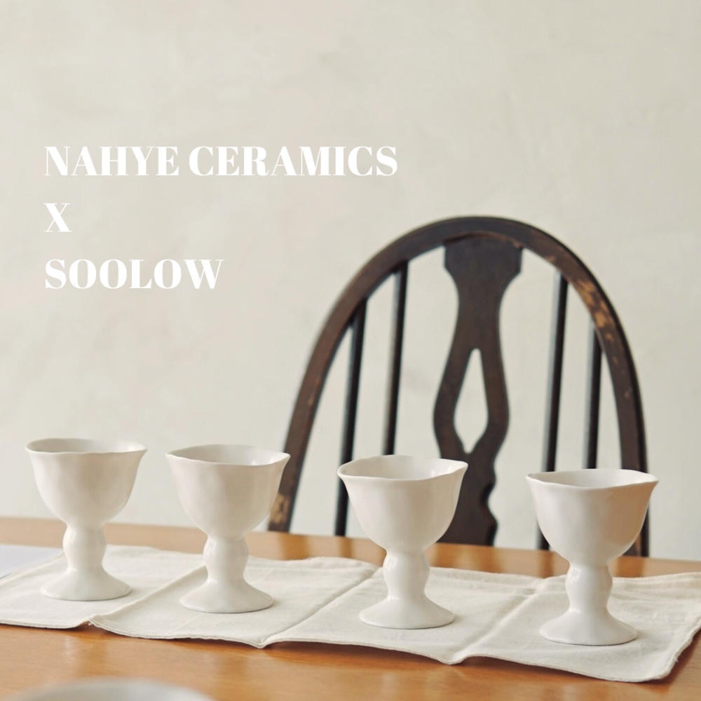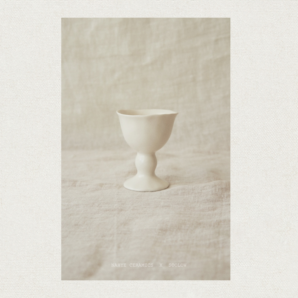 손으로 꾹꾹 눌러 빚어 만든 듯한 자연스러움, 정형화되지않은 곡선과 기울기 그리고 따뜻함이 느껴지는 부드러운 백색의 도자기. 박나혜 작가의 작품은 술로우가 그리는 그림에 조화롭게 부합하였습니다. 약 1년여의 샘플 과정을 거쳐 술로우의 감성을 더하고 마침내 세상에 단 하나뿐인 잔으로 탄생하였습니다.