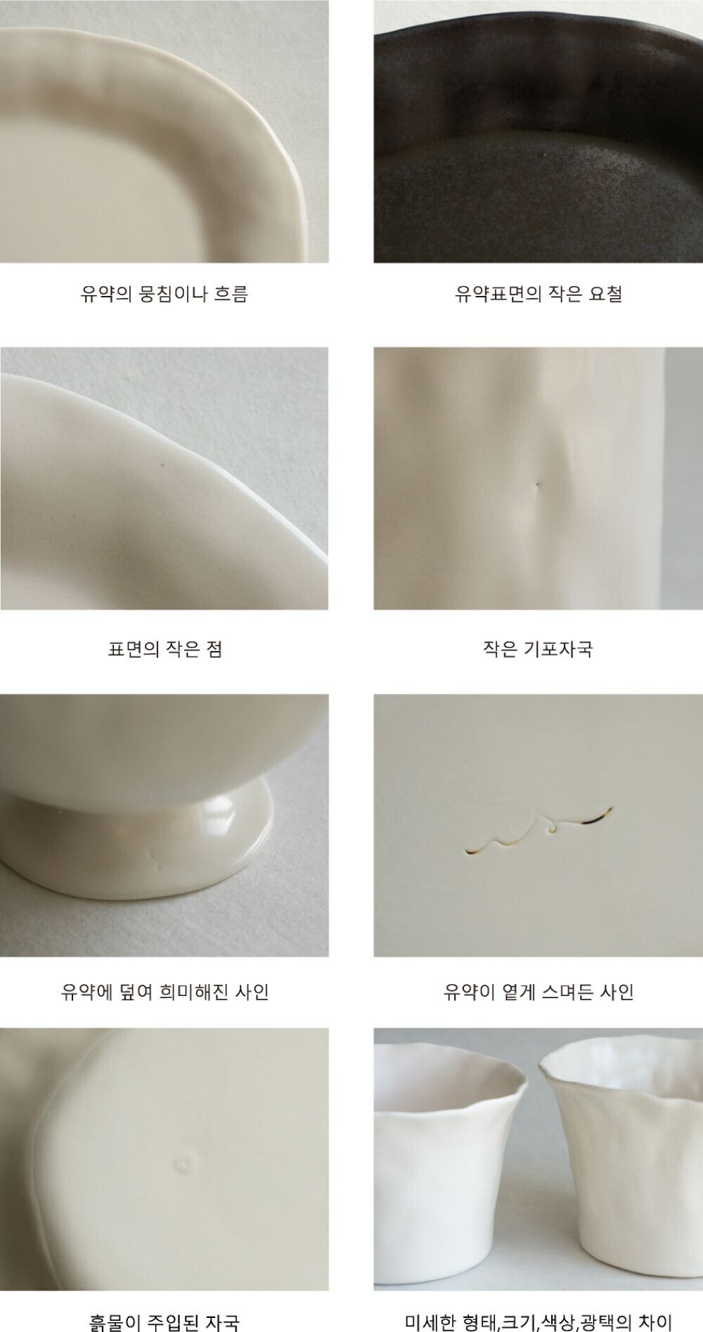 아래 사항들은 도자기 제작의 특성상 자연스러운 현상입니다. 아래 사항을 사유로 교환/반품을 원하실 때에는 한번 더 확인 부탁드립니다.